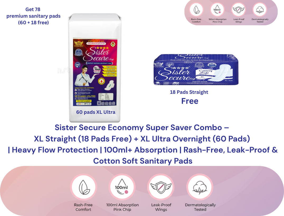 Sister Secure Economy Super Saver Sanitary pad Combo – XL Straight (18 Pads Free) + XL Ultra Overnight (60 Pads) | Heavy Flow Protection | 100ml+ Absorption | Rash-Free, Leak-Proof & Cotton Soft Sanitary Pads